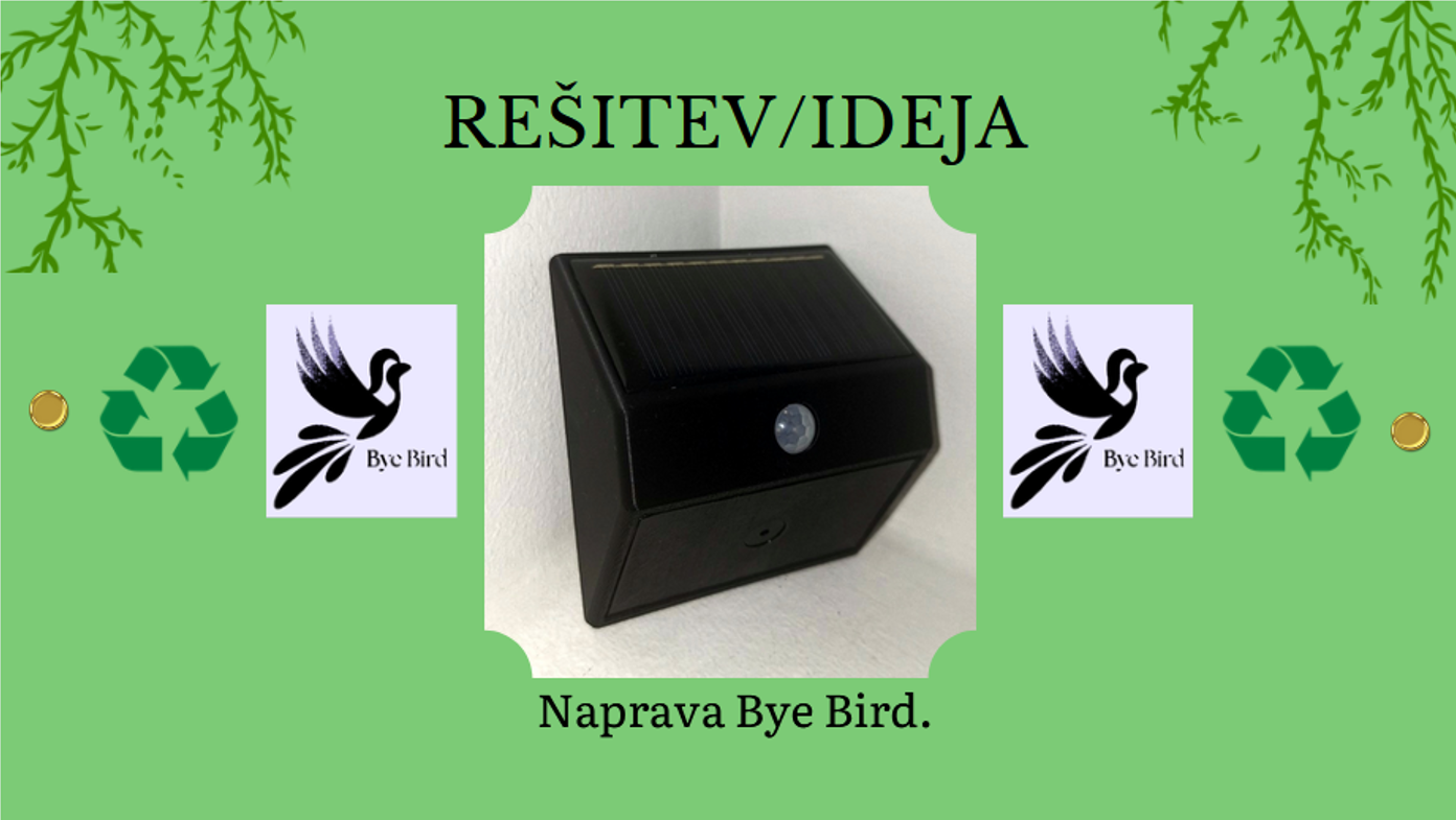 Bye Bird je inovativna, trajnostna in humana eko-naprava za odganjanje ptic, ki učinkovito preprečuje njihovo zadrževanje na objektih, ne da bi jim pri tem povzročala bolečine ali poškodbe. Naprava je zasnovana z mislijo na sobivanje človeka in narave ter predstavlja okolju prijazno alternativo agresivnim metodam odganjanja ptic.