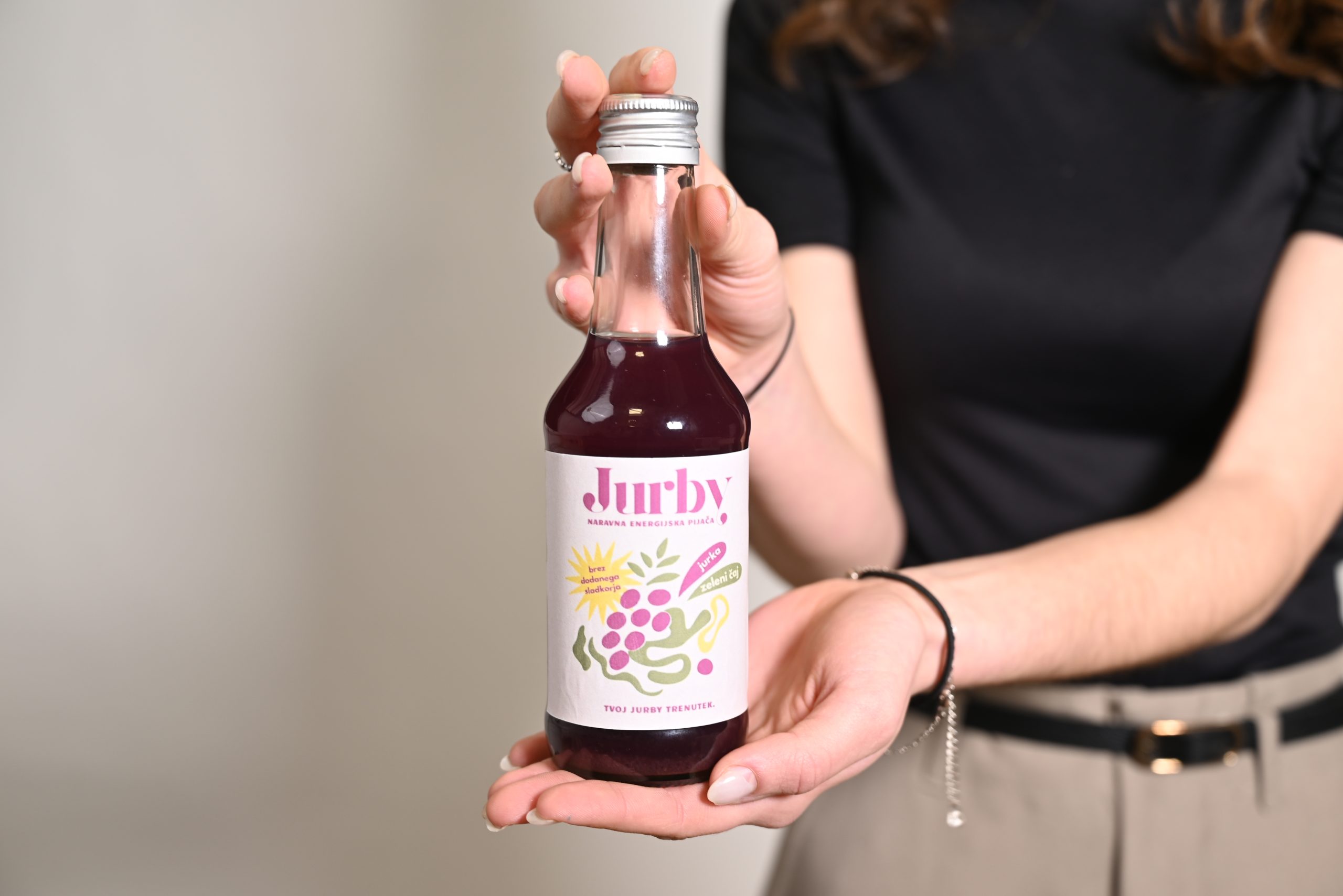 Jurby je naravni poživilni napitek, ki nadomesti umetne in nezdrave energijske pijače na slovenskem trgu. Zasnovan je na osnovi zelenega čaja, z dodatkom jurkinega soka in izvlečkom mete. Na slovenskem trgu, kot dijakinje opažamo vse večjo potrebo po izdelkih, ki so narejeni iz naravnih sestavin in ne vsebujejo umetnih dodatkov. Jurby odgovarja na to tržno priložnost z uporabo naravnih in lokalnih sestavin. Naš izdelek se od konkurence razlikuje po svoji naravni sestavi, skrbno izdelani recepturi, lokalnih sestavinah in ročni izdelavi. Jurby ima potencial, da postane prepoznaven domač izdelek, ki združuje naravnost, energijo in sodoben življenjski slog.