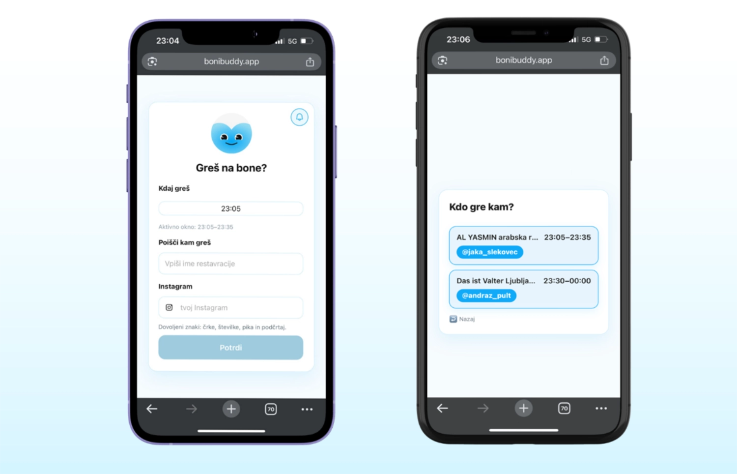 Bonibuddy je preprosta spletna platforma, namenjena študentom, ki si želijo družabnega obroka, a pogosto nimajo s kom iti jest ali se jim ne da dolgo usklajevati prek sporočil. Ideja temelji na tem, da študent hitro označi, kam in kdaj gre na kosilo, ter vidi druge, ki nameravajo isto. Tako platforma spodbuja spontana srečanja v živo in zmanjšuje občutek osamljenosti, hkrati pa restavracijam, ki ponujajo študentske bone, omogoča večjo vidnost ravno v trenutku, ko se študenti odločajo, kam bodo šli jest. Bonibuddy rešuje čisto vsakdanji problem na enostaven, študentom blizu način in združuje hrano, druženje ter praktičnost v eni ideji.