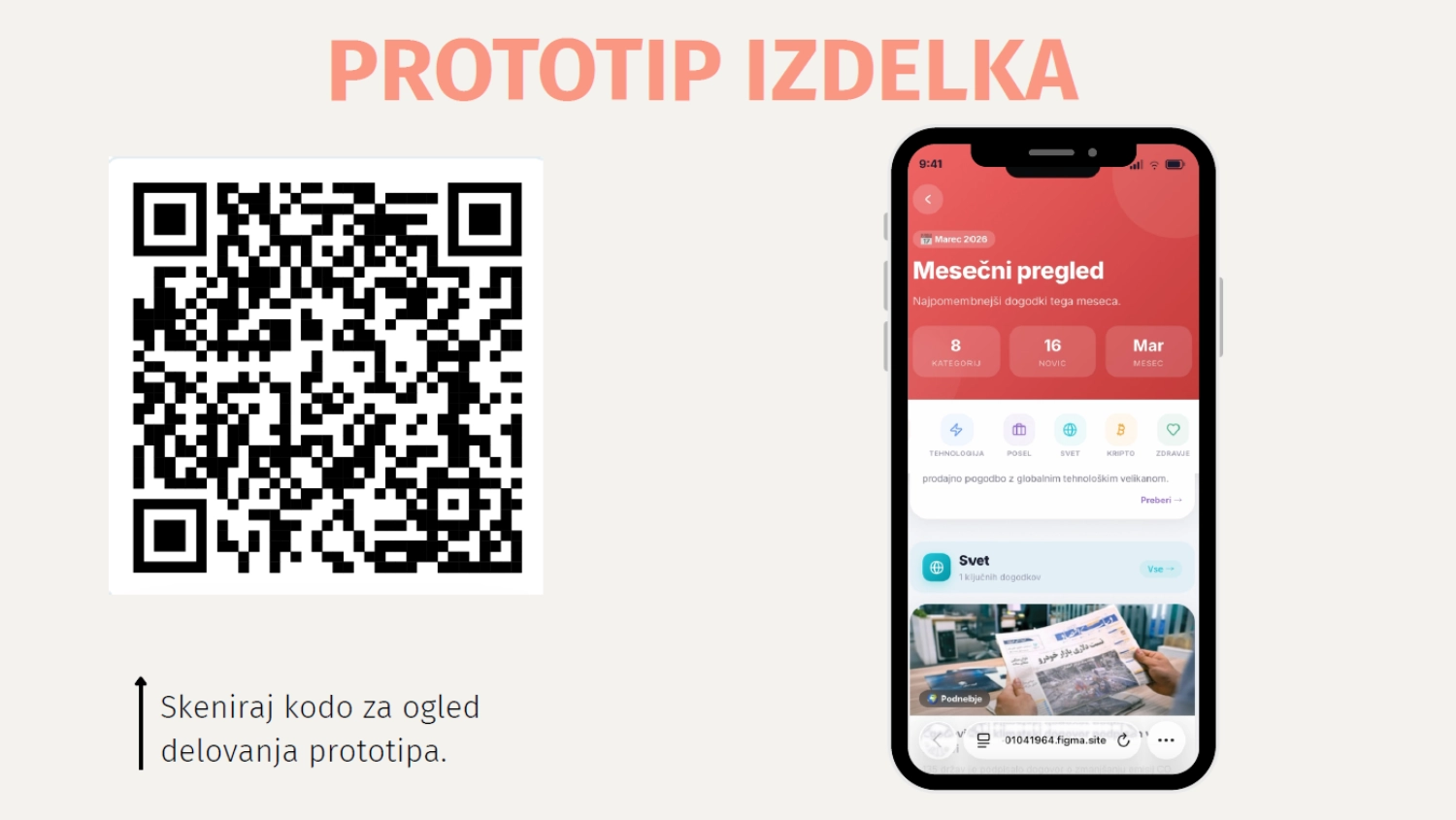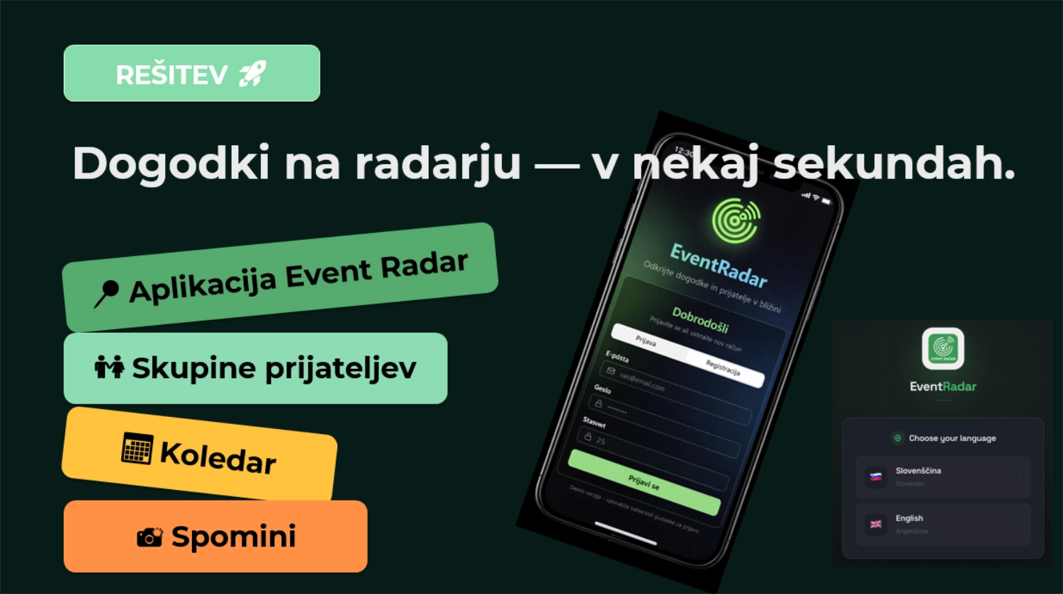 Event Radar je digitalna mobilna aplikacija za centralizirano in personalizirano iskanje dogodkov v lokalnem okolju. Namenjena je reševanju problema razdrobljenih in nepreglednih informacij o dogodkih, kar neposredno vpliva na nizko obiskanost. Aplikacija na enem mestu povezuje uporabnike, organizatorje dogodkov in lokalno skupnost. Uporabnikom omogoča iskanje dogodkov glede na lokacijo, interese, starost in čas, organizatorjem pa ponuja cenovno dostopen, digitalen in okolju prijazen promocijski kanal.