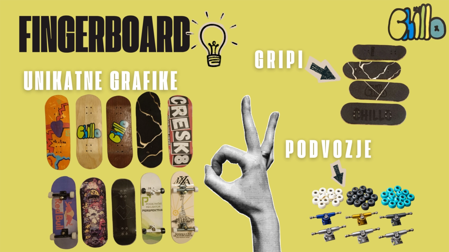 CHILLO je projekt ročno izdelanih fingerboardov, lesenih ramp in dodatkov, ki mladim ponuja zabavno in ustvarjalno alternativo času pred zasloni. Uporabniki si lahko izberejo lastno grafiko, pri čemer združujemo kakovostno izdelavo in dostopno ceno, saj so obstoječi kakovostni izdelki na trgu pogosto predragi. Izdelke razvijava in izdelujeva sama, prototipi pa so že prejeli zelo pozitivne odzive. Ciljni kupci so otroci, najstniki, starši ter skate trgovine, prodaja pa bo potekala preko spleta in partnerskih prodajnih mest. Svojo poslovno idejo sva razvijala v Centru za mlade Petka, Zavod samostojen si.