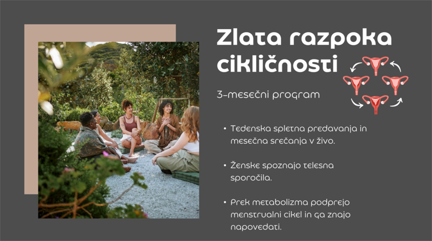 MOČ, KI SE RODI IZ RAZUMEVANJA ŽENSKEGA CIKLA. Ko ženska sebi podeli dovoljenje, namesto površinskega odpravljanja simptomov podpira notranjo regulacijo, metabolno fleksibilnost in zaupanje v telesu lastno inteligenco. Metoda je zasnovana kot simbolno-mističen proces aktualizacije ženskega potenciala skozi menstrualne modrosti in ciklično naravo ženske biologije. Mlade ženske skozi celosten transformativen 9 mesečni program v praksi spoznajo svoj cikel in telesne signale, podprejo hormone, regulacijo stresa, umirijo vnetje, zmanjšajo bolečine, preoblikujejo svoje telo, dobijo nov zagon, podoporo in motivacijo. Tako menstrualni cikel ni več ovira ženskega vsakdana, ampak močno orodje, ki žensko opolnomoči in podpre njeno produktivnost.