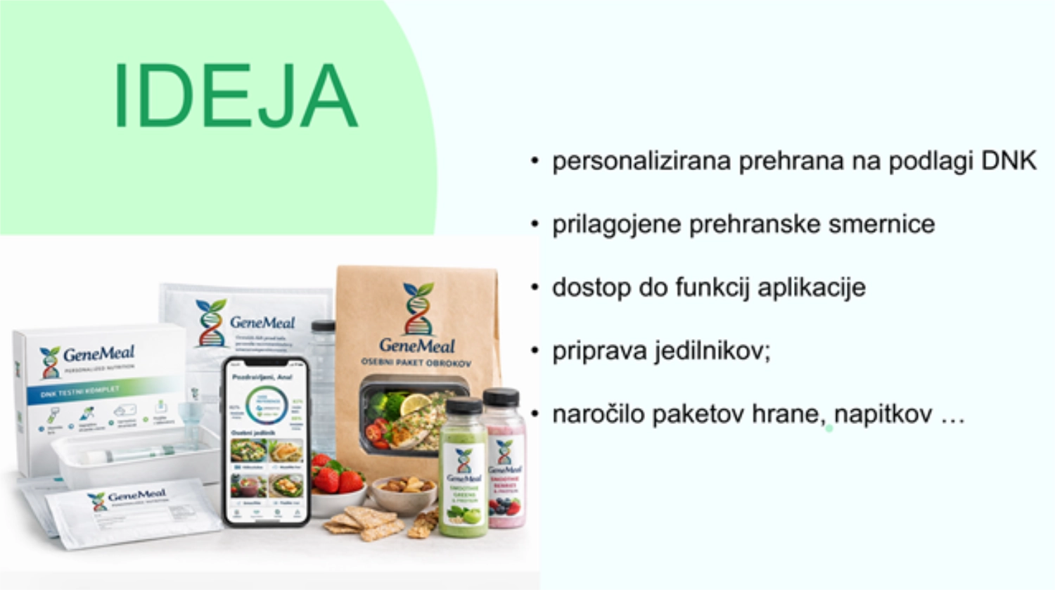 GeneMeal je digitalna platforma in mobilna aplikacija za personalizirano prehrano, ki na podlagi DNK analize posamezniku ponuja prehrano, prilagojeno njegovemu telesu. Aplikacija upošteva genetske značilnosti posameznika, njegove prehranske cilje (npr. več energije, boljše počutje, hujšanje ali regeneracijo) ter morebitne prehranske občutljivosti. Vizija podjetja GeneMeal je pomagati ljudem razviti bolj zdrave prehranske navade in dolgoročno izboljšati njihovo počutje in zdravje. Vaša genetika. Vaša prehrana. Vaš rezultat. GeneMeal, prehrana, ki vas pozna.
