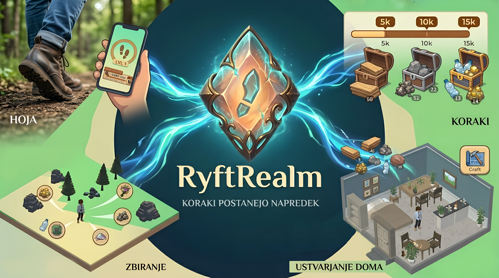 RyftRealm je mobilni projekt, ki vsakodnevno hojo spremeni v jasen, igralni razlog za gibanje. Namenjen je predvsem ljudem, ki sicer uporabljajo telefon in radi igrajo, vendar jim klasično štetje korakov ne da dovolj motivacije za vztrajnost. Koraki niso le številka, ampak prehod do napredka: sprehod postane kratka pustolovščina z občutkom zbiranja, odkrivanja in dolgoročnega ustvarjanja.
