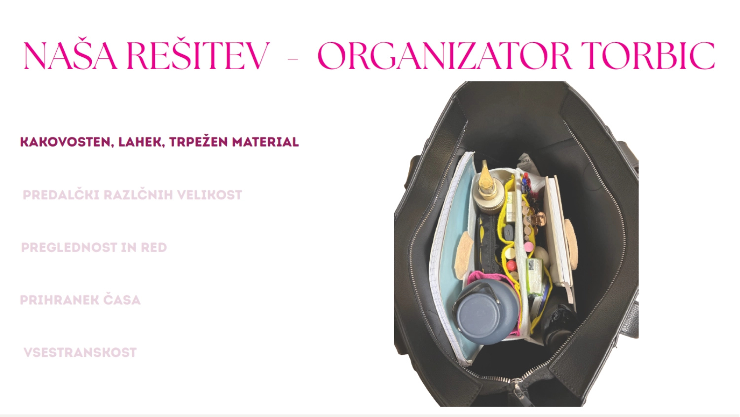 VANA je praktičen organizator torbic, ki uporabnicam zagotavlja popolno preglednost vsebine in omogoča hitro menjavo torbic brez dolgotrajnega iskanja ali prestavljanja predmetov. Izdelek rešuje problem neurejenosti, ki je posebej izrazit pri večjih modelih torbic brez notranjih predalov.