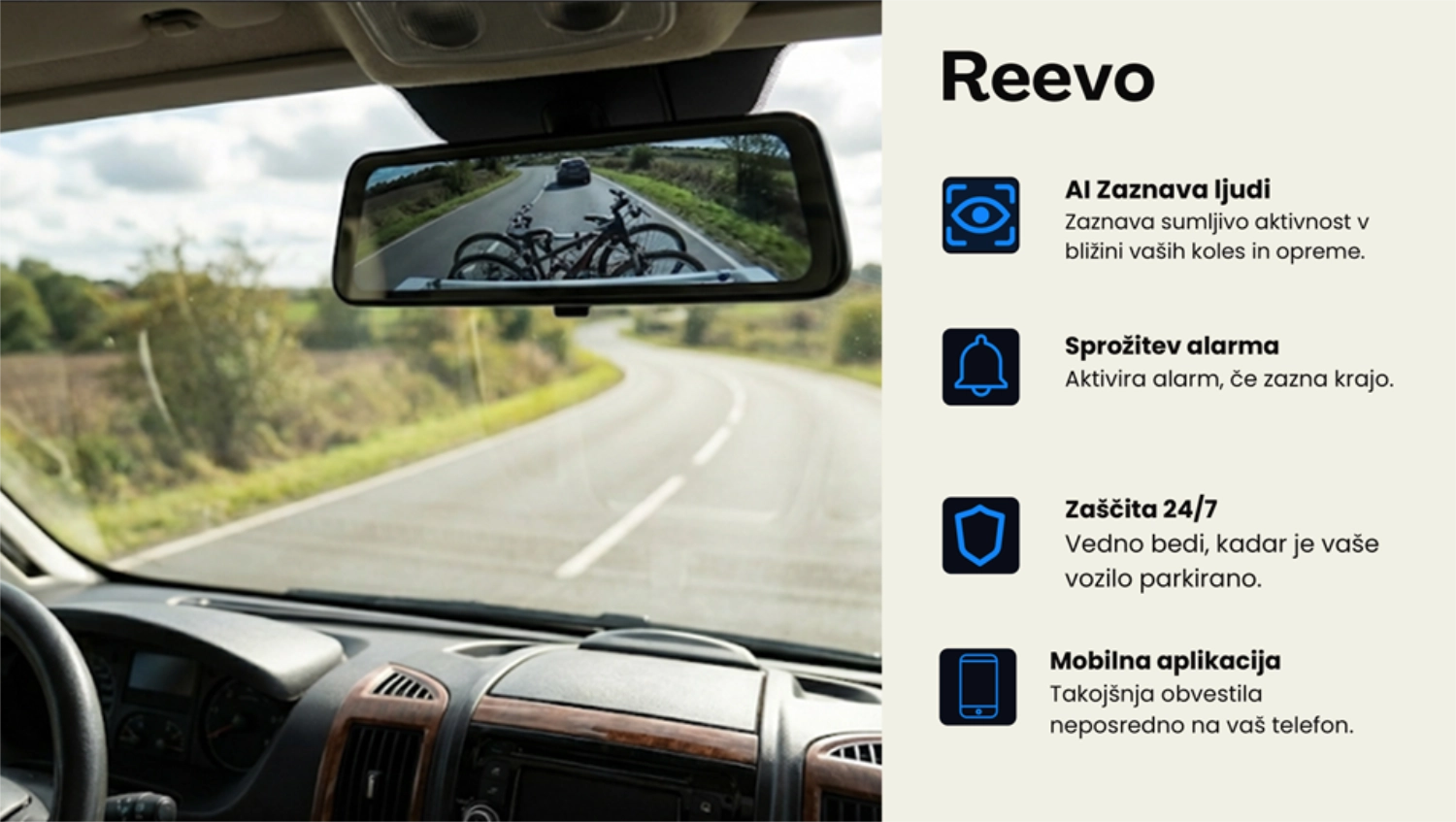 Reevo je pametno digitalno ogledalo za avtodome in kombije, ki s pomočjo visoko kakovostne zadnje kamere vozniku zagotavlja neprekinjen in jasen pogled na dogajanje za vozilom med vožnjo naprej. Ko je vozilo parkirano, sistem uporablja umetno inteligenco za varovanje koles in opreme, pri čemer lastnika o sumljivih osebah obvesti preko aplikacije ali samodejno sproži alarm. Poslovna strategija se osredotoča na vgradnjo sistema kot dodatne opreme pri večjih proizvajalcih počitniških vozil ter na neposredno prodajo končnim uporabnikom.